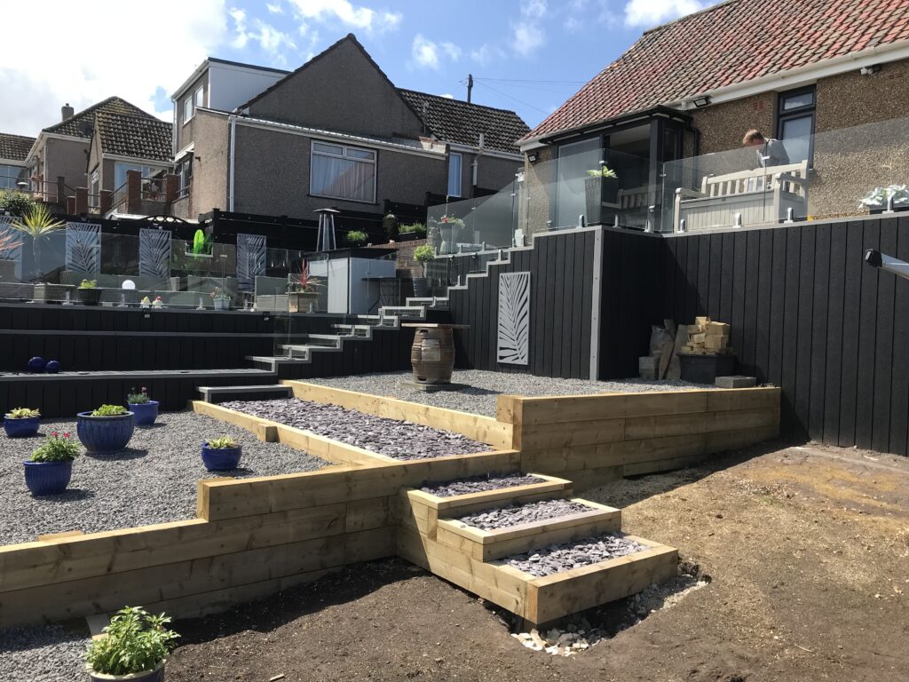 The completion of composite terraced decking, mounting of toughened safety glass balustrading and landscaping of the garden.